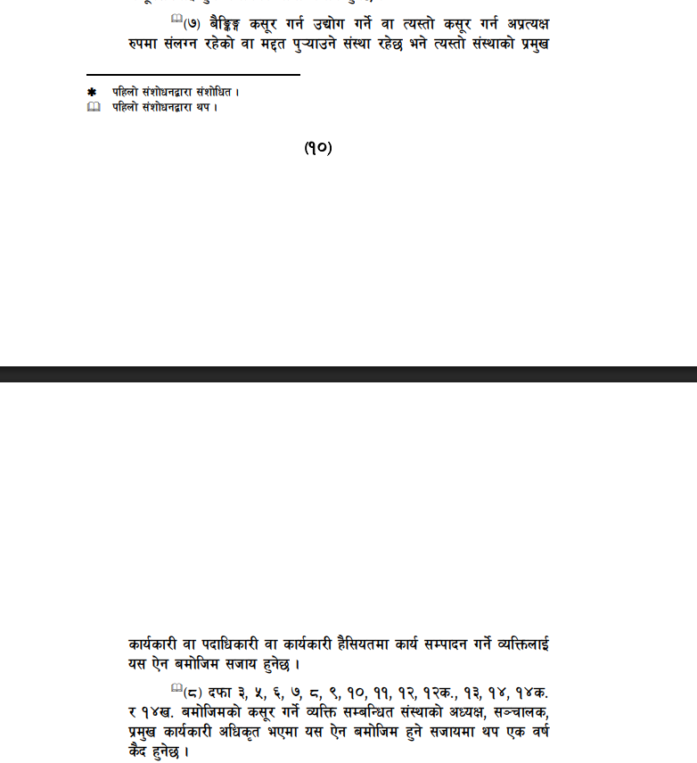 सो परिक्षेद ३मा भएको दण्ड सजाय सम्बन्धि व्यवस्थामा १० लाख रुपयाँसम बिगो भए एक बर्षसम्म कैद, दश लाख रुपैयाँसम्म भन्दा बढी पचास लाख रुपैयासम्म बिगो भए दुई वर्षदेखि तीन वर्षसम्म कैद, पचास लाख रुपैयाँभन्दा बढी एक करोड रुपैयासम्म बिगो भए तीन वर्षदेखि चार वर्षसम्म कैद, एक करोड रुपैयाभन्दा बढी दश करोड रुपैयासम्म बिगो भए चार वर्षदेखि छ वर्षसम्म कैद, र दश करोड रुपैयाभन्दा बढी पचास करोड रुपैयासम्म बिगो भए छ वर्षदेखि आठ वर्षसम्म कैद, र पचास करोड रूपैयाभन्दा बढी एक अर्ब रुपैयासम्म बिगो भए आठ वर्षदेखि दश वर्षसम्म कैदको व्यवस्था गरिएको छ । सोहि ऐनले प्रष्टसँग यस्तो कसुरजन्य काममा सघाउनेलाई सजायको व्यवस्था गरेको छ ।