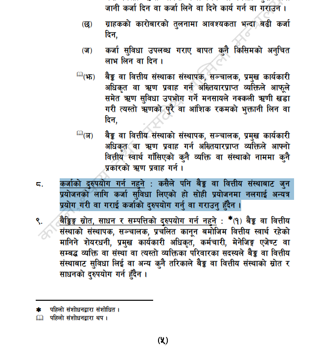 एउटा प्रयोजनका लागि लिएको ऋण अर्को प्रयोजनमा खर्च गर्न पाइन्छ कि पाइँदैन भन्ने कुरा नेपालका बैंकिङ कानुनमा स्पष्ट प्रावधान छ। बैंकिङ कसुर तथा सजाय ऐन, २०६४ यस ऐनको परिक्षेद १ अन्तर्गत दफा ८ले एउटा प्रयोजनका लागि लिएको ऋण अर्को प्रयोजनमा खर्च गर्न नपाइने प्रष्ट व्यवस्था गरेको छ । सोहि ऐनको परिक्षेद ३ मा यस्तो काम गर्नेलाई दण्ड सजाय तोकिएको छ । यस्तो गलत काम गर्नेलाई बिगो अनुसारको सजाय निर्धारण हुने ऐनमा प्रष्ट व्यवस्था गरिएको छ ।