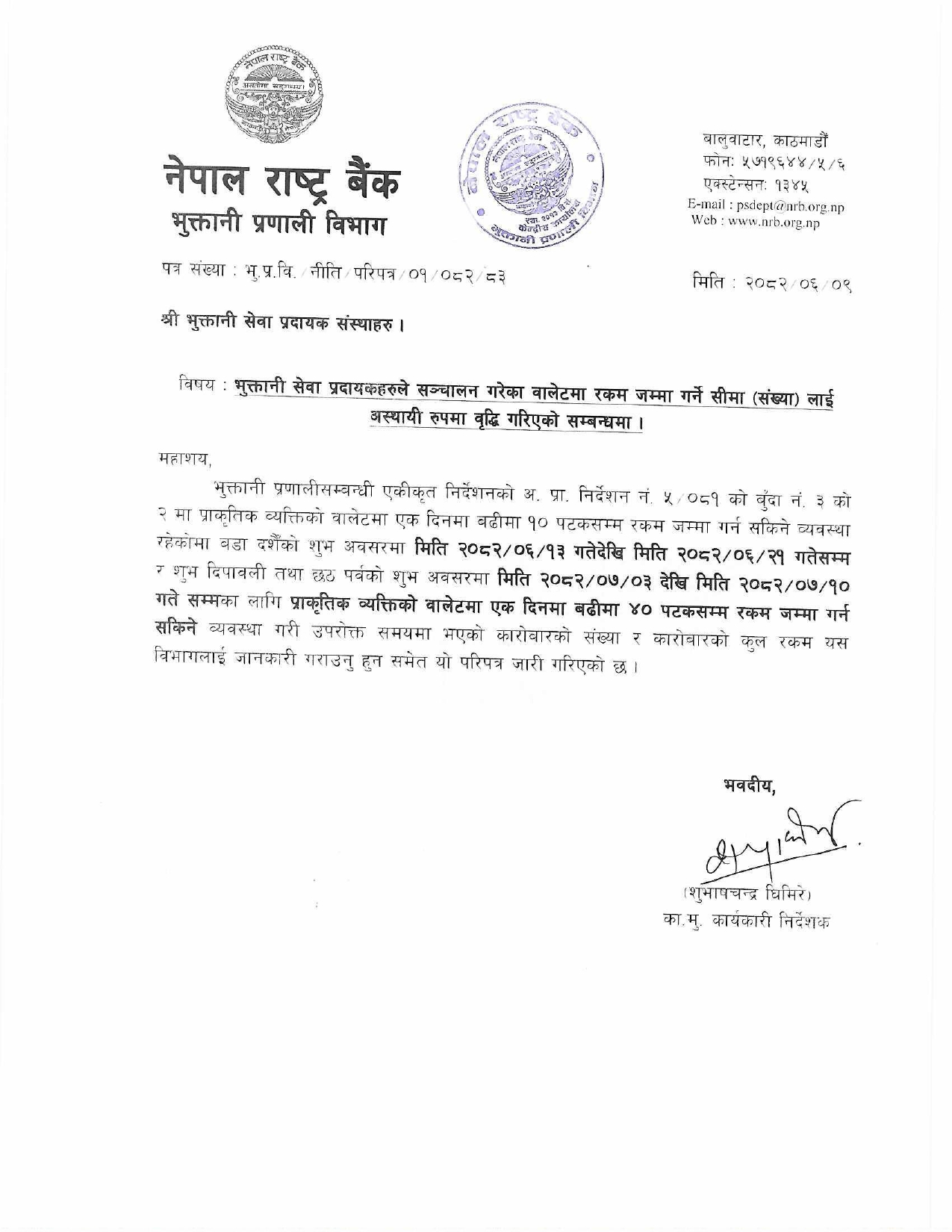 काठमाडौँ। नेपाल राष्ट्र बैंकले भुक्तानी सेवा प्रदायकहरुले सञ्चालन गरेको वालेटमा रकम जम्मा गर्ने सीमा अस्थायी रुपमा बढाएको छ। राष्ट्र बैंकले शुक्रबार एक सूचना जारी गर्दै भुक्तानी सेवा प्रदायकहरुले सञ्चालन गरेको वालेटमा रकम जम्मा गर्ने सीमा अस्थायी रुपमा बढाएर दैनिक ४० पटकसम्म पुर्याएको हो।