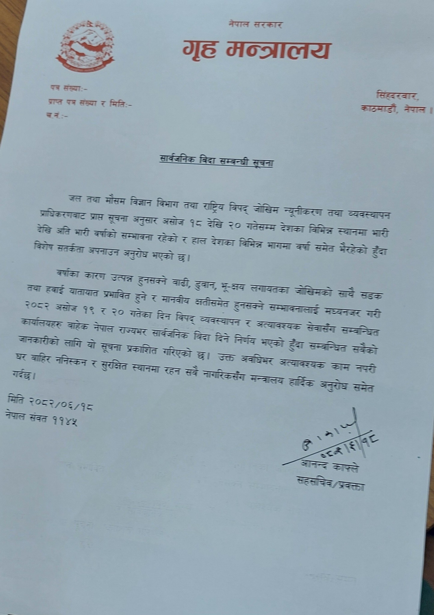 काठमाडौँ । अविरल वर्षाले सिर्जना गरेको प्रतिकूल अवस्थालाई ध्यानमा राख्दै सरकारले थप दुई दिन सार्वजनिक बिदा दिने निर्णय गरेको छ । गृहमन्त्री ओमप्रकाश अर्यालका अनुसार आइतबार र सोमबार सरकारी कार्यालयहरू बन्द रहनेछन् ।