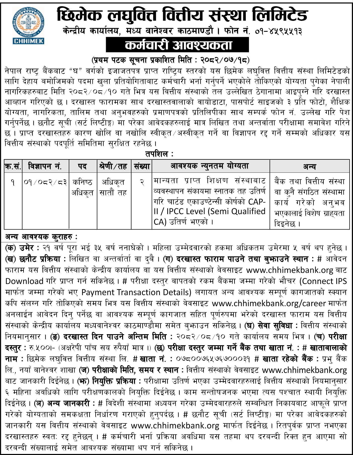 आवेदन मंसिर १० गतेभित्र दिनुपर्ने छिमेक लघुवित्त वित्तीय संस्थाले जनाएको छ। सूचनासहित: