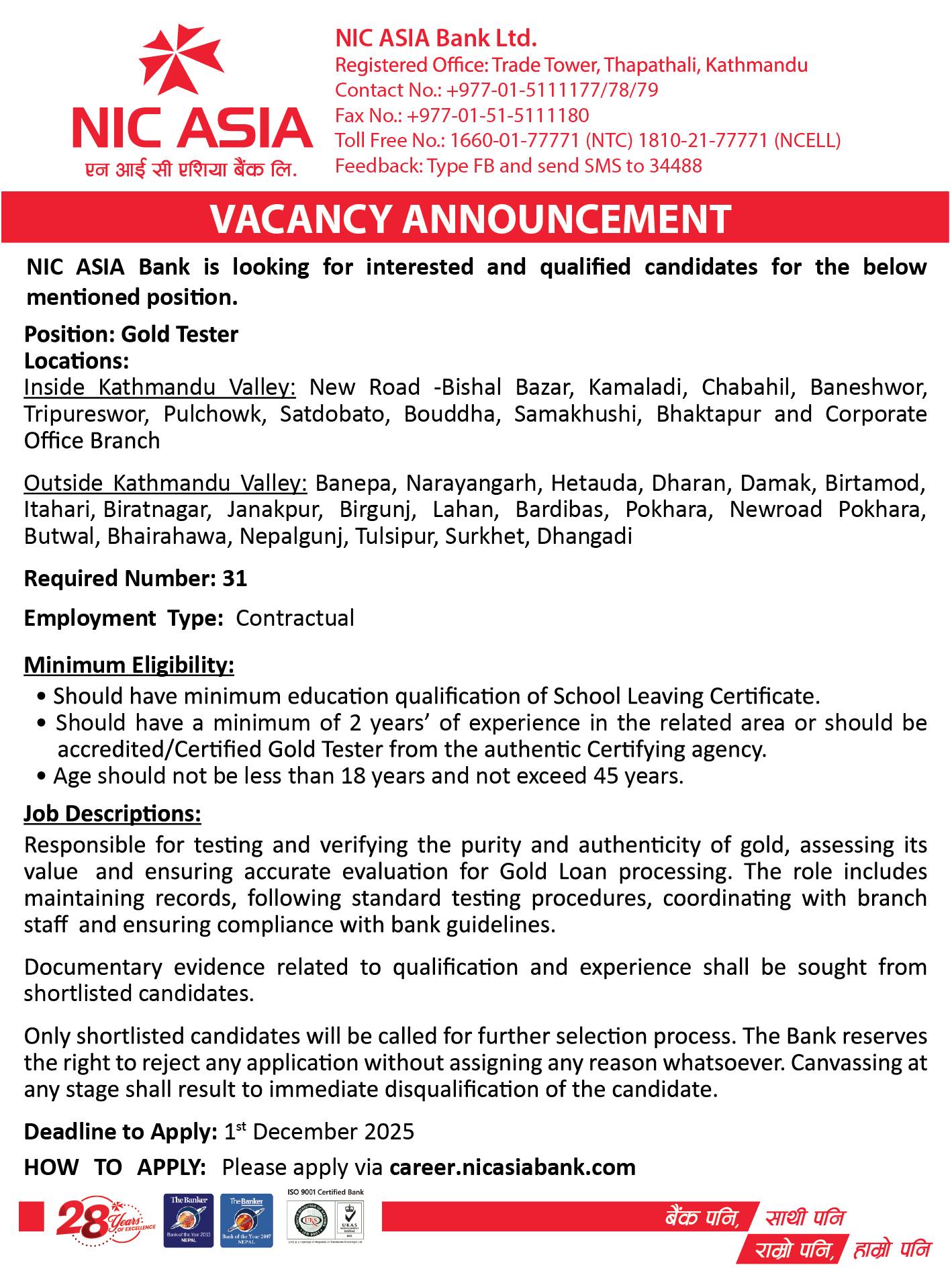 बैंकले काठमाडौँ उपत्तयका भित्र र बाहिरका शाखाका लागि ३१ जना गोल्ड टेस्टर माग गरेको हो। सो बैंकमा काम गर्न चाहनेले मंसिर १५ गतेभित्र आवेदन दिन सक्नेछन्।