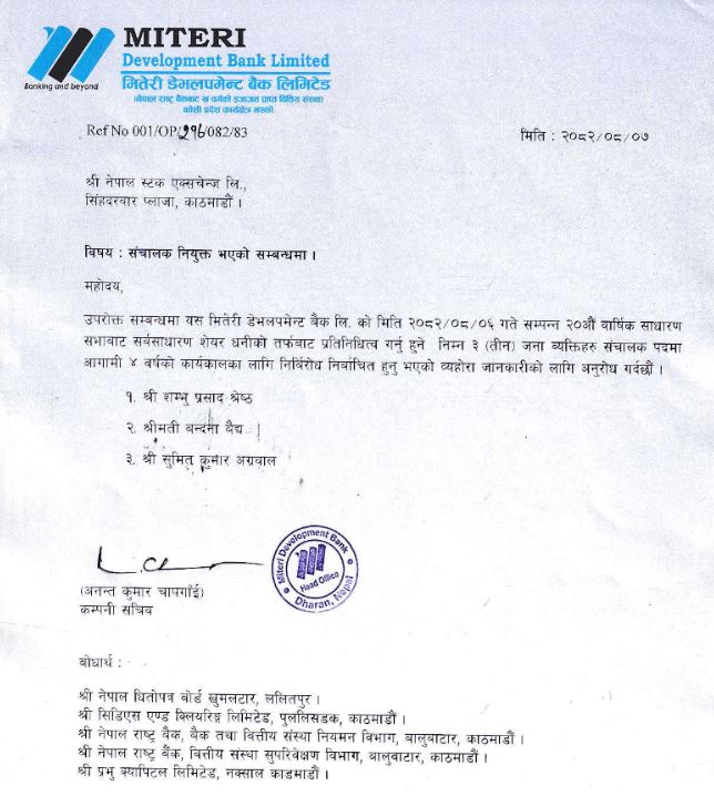 काठमाडौँ। मितेरी डेभलपमेन्ट बैंकले सञ्चालक नियुक्त गरेको छ। बैंकले एक सूचना जारी गर्दै तीन जना सञ्चालक नियुक्त गरेको हो।