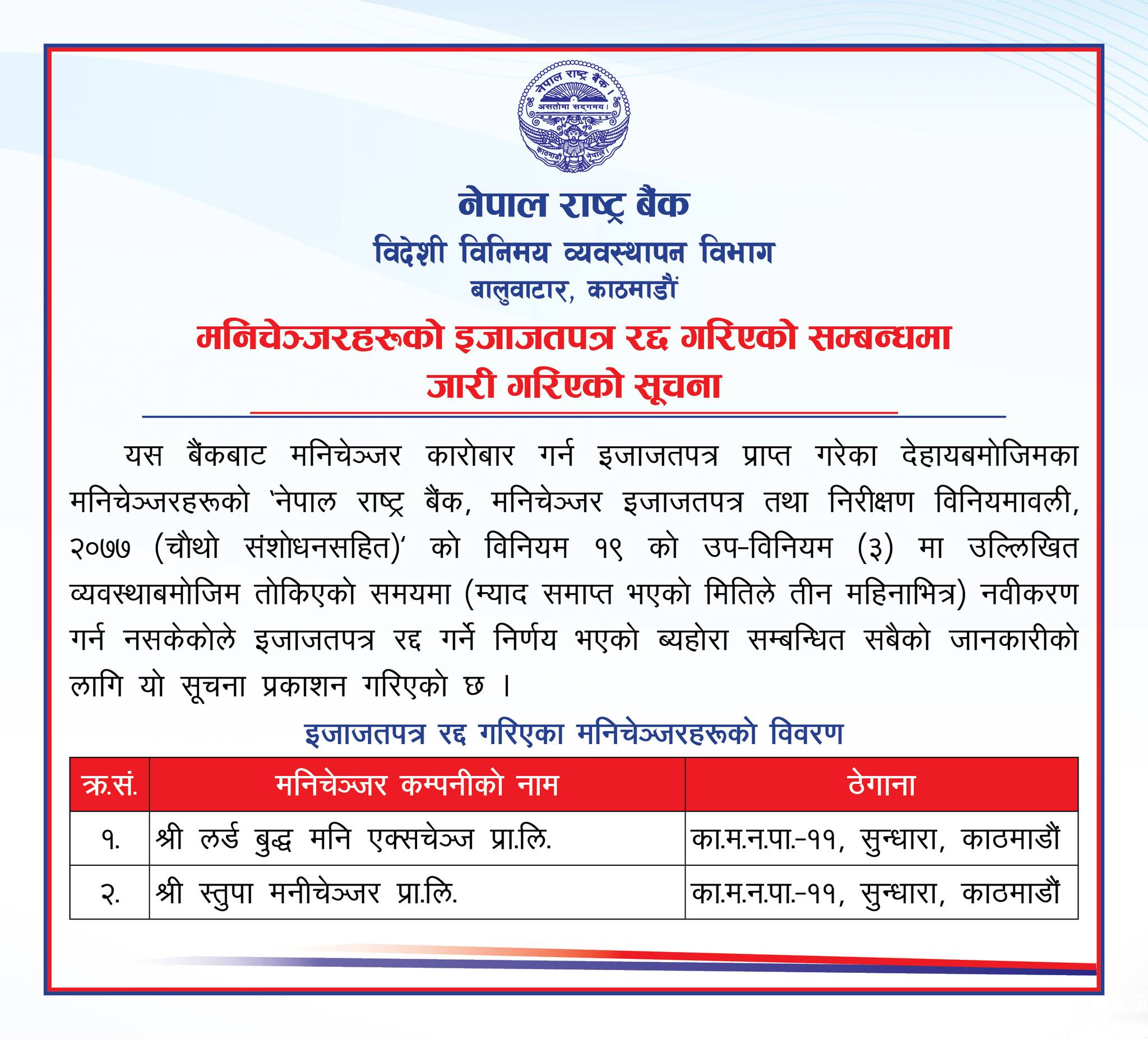 काठमाडौँ। नेपाल राष्ट्र बैंकले दुई मनिचेन्जरको लाइसेन्स रद्द गरेको छ। राष्ट्र बैंकले लर्ड बुद्ध मनी एक्सचेन्ज र स्तुपा मनिचेन्जरको लाइसेन्स रद्द गरेको हो।