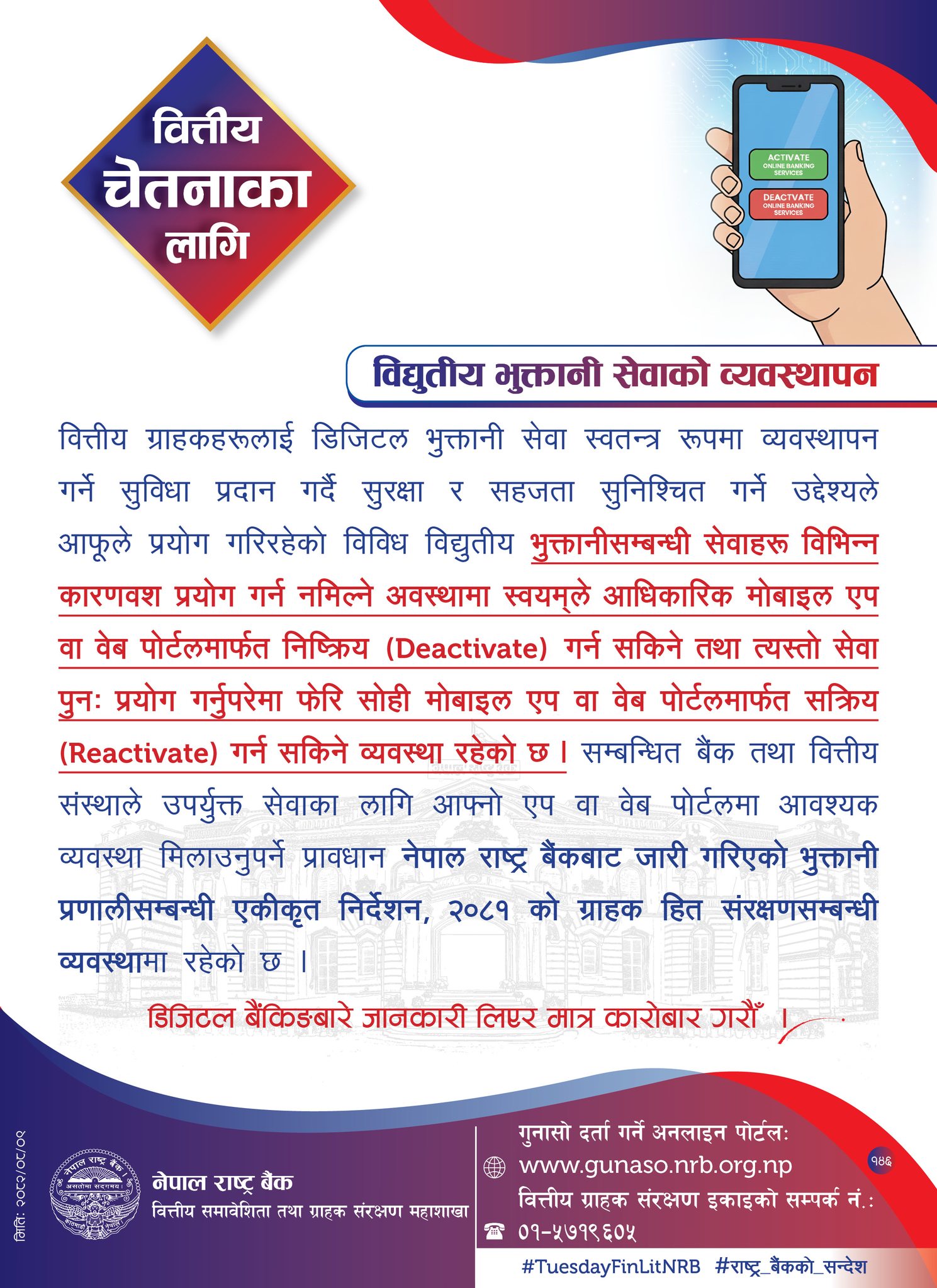 उक्त सूचनामा भनिएको छ, ‘ वित्तीय ग्राहकलाई डिजिटल भुक्तानी सेवा स्वतन्त्र रुपमा व्यवस्था गर्ने सुविधा प्रदान गर्दै सुरक्षित र सहज सुनिश्चित गर्ने उद्देश्यले आफूले प्रयोग गरिरहेको विविध विद्युतीय भुक्तानीसम्बन्धी सेवाहरु विभिन्न कारणवश प्रयोगगर्न नमिल्ने अवस्थामा स्वयंले आधिकारिक मोबाइल एप वा वेब पोर्टलमार्फत निष्क्रिय गर्न सकिने व्यवस्था रहेको छ, यदि त्यस्तो सेवा पुन: प्रयोग गर्नुपरेमा फेरि मोबाइल एप वा वेब पोर्टलमार्फत सक्रिय गर्न सकिने व्यवस्था रहेको छ।’