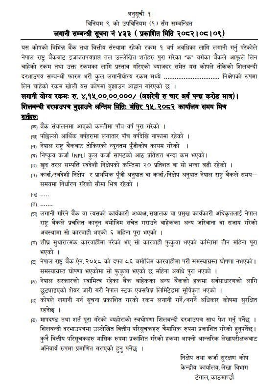 उक्त निक्षेप लिन चाहने बैंकहरुले मंसिर १५ कार्यालय समयभित्र आवेदन बुझाउनु पर्नेछ।