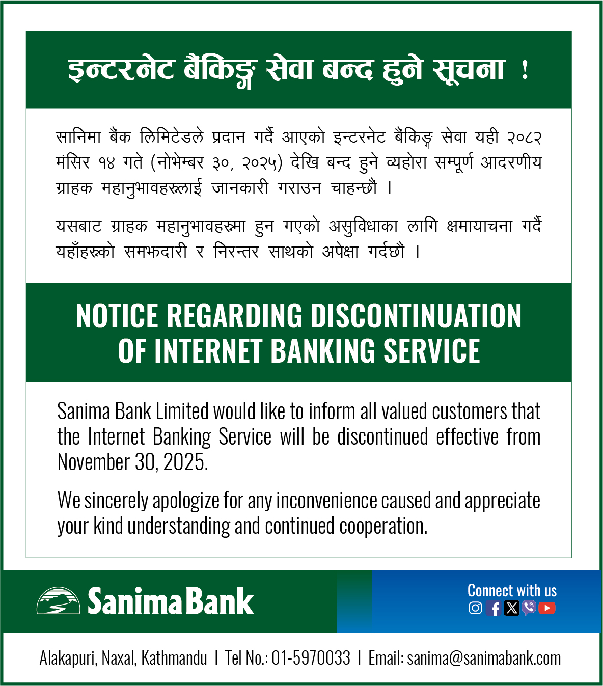 बैंकले आफ्नो इन्टरनेट बैंकिङ्ग सेवा २०८२ मंसिर १४ गतेदेखि स्थायी रूपमा बन्द गर्ने निर्णय गरेको छ भने इन्टरनेट बैंकिङ्ग सेवा बन्द हुँदा हुन सक्ने असुविधाप्रति बैंकले दु:ख प्रकट गरेको छ ।