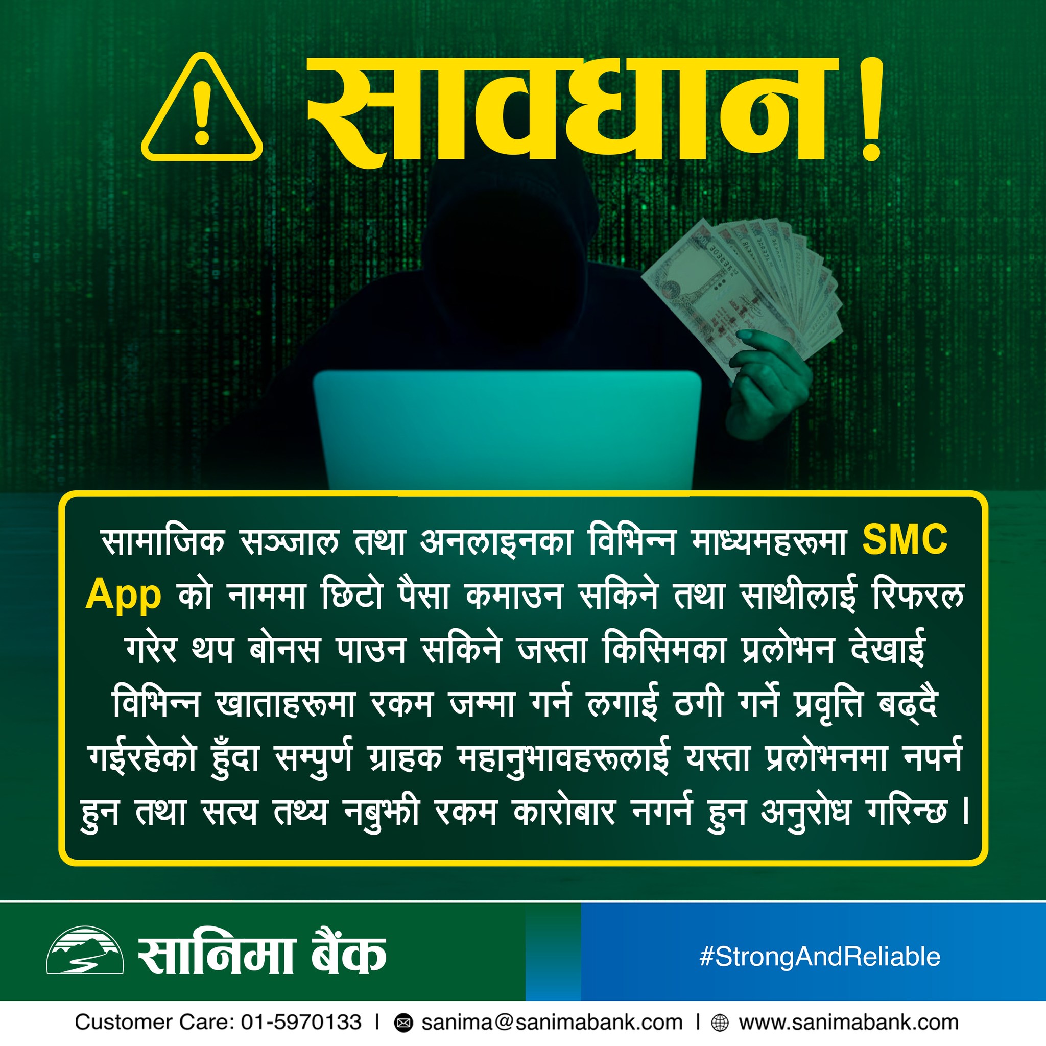 सामाजिक सञ्जाल तथा अनलाइनमा SMC App को नाममा छिटो पैसा कमाउन सकिने, साथीलाई रिफर गरेर थप बोनस पनि पाउन सकिने जस्ता किसिमका प्रलोभन देखाएर विभिन्न बैंक खाताहरूमा पैसा जम्मा गर्न लगाई ठगी हुने गरेको पाइएपछि ग्राहकहरूलाई सचेत रहन सानिमा बैंकले अनुरोध गरेको छ। सूचनासहित: