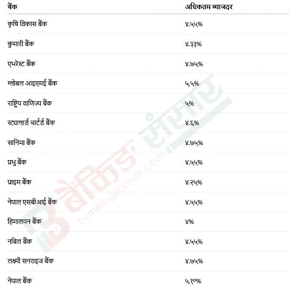 व्यक्तिगत मुद्दति निक्षेपमा अधिकत ब्याजदर कृषि विकास बैंकले ४.५५ प्रतिशत, कुमारी बैंकले ४.३३ प्रतिशत, एभरेष्ट बैंकले ४.७५ प्रतिशत, ग्लोबल आइएमई बैंकले ५.५ प्रतिशत, राष्ट्रिय वाणिज्य बैंकले ५ प्रतिशत, स्ट्यान्डर्ड चार्टर्ड बैंकले ४.६ प्रतिशत, सानिमा बैंकले ४.७५ प्रतिशत, प्रभु बैंकले ४.५५ प्रतिशत, प्राइम बैंकले ४.२५ प्रतिशत, नेपाल एसबीआई बैंकले ४.५५ प्रतिशत, हिमालयन बैंकले ४ प्रतिशत, नबिल बैंकले ४.५५ प्रतिशत, लक्ष्मी सनराइज बैंकले ४.७५ प्रतिशत र नेपाल बैंकले ५.१० प्रतिशत पुर्याएका छन्।