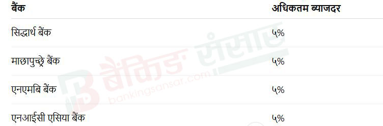 त्यस्तै, सिद्धार्थ बैंक, माछापुच्छ्रे बैंक, एनएमबि बैंक र एनआईसी एसिया बैंकले व्यक्तिगत मुद्दति निक्षेपमा अधिकतम ५ प्रतिशत ब्याजदर नै दिने भएका छन्। उक्त बैंकहरूले पुस महिनामा ब्याजदर स्थिर राखेका छन्।