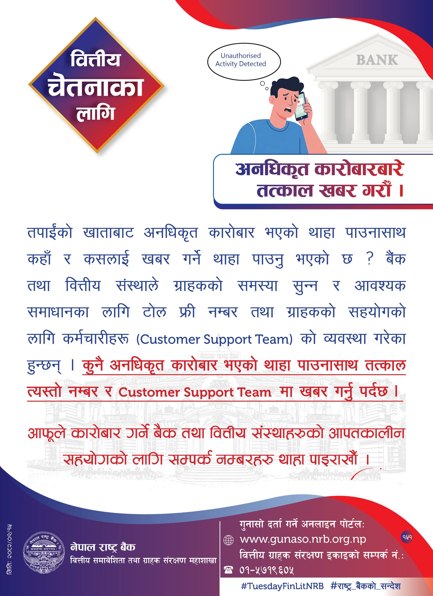 राष्ट्र बैंकको सूचनामा भनिएको छ, ‘तपाइँको खाताबाट अनधिकृत कारोबार भएको थाहा पाउनासाथ कहाँ र कसलाई खबर गर्ने थाहा पाउनु भएको छ ?, बैंक तथा वित्तीय संस्थाले ग्राहकको समस्या समाधान सुन्न र आवश्यक समाधानका लागि टोल फ्री नम्बर तथा ग्राहकको सहयोगका लागि कर्मचारी (कस्टमर सपोर्ट टिम)को व्यवस्था गरेका हुन्छन्।’