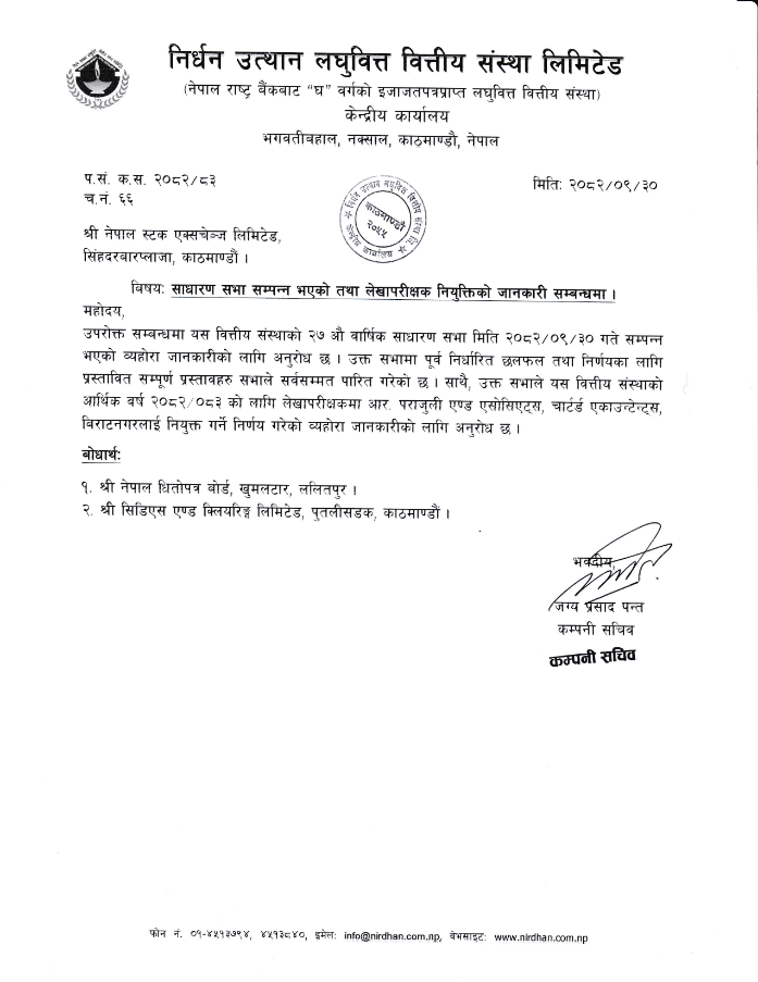 कम्पनीको पुस ३० गते सम्पन्न भएको साधारण सभाले आर्थिक वर्ष २०८२ /८३ को लागि लेखापरीक्षक नियुक्त गरेको हो ।