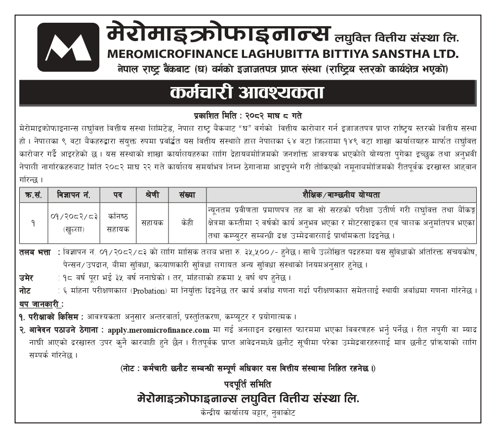मेरोमाइक्रोफाइनान्स लघुवित्तमा खुल्यो ३५ हजारको जागिर