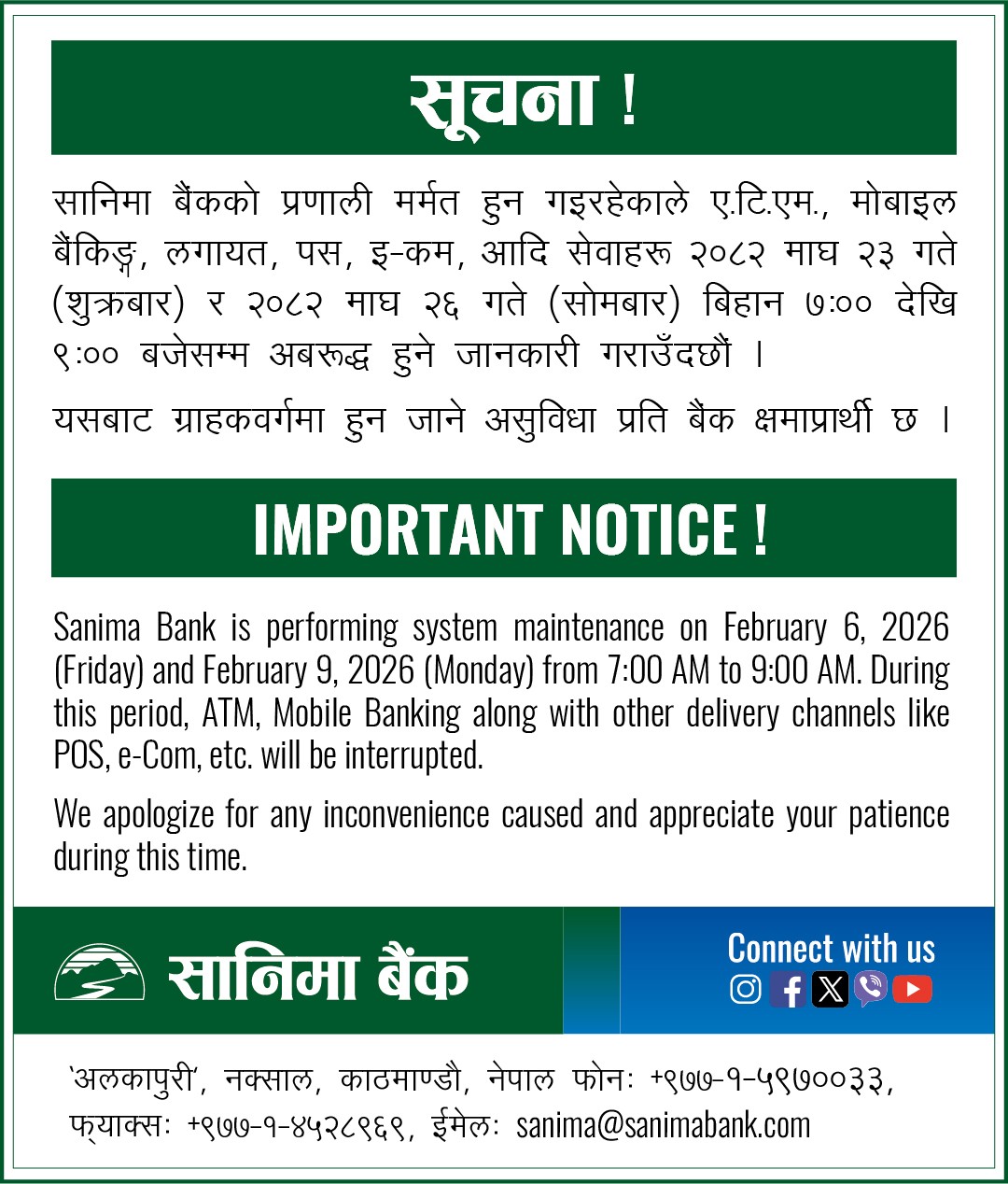 दुई दिन सानिमा बैंकको बैंकिङ सेवा अबरुद्ध हुने (सूचनासहित)