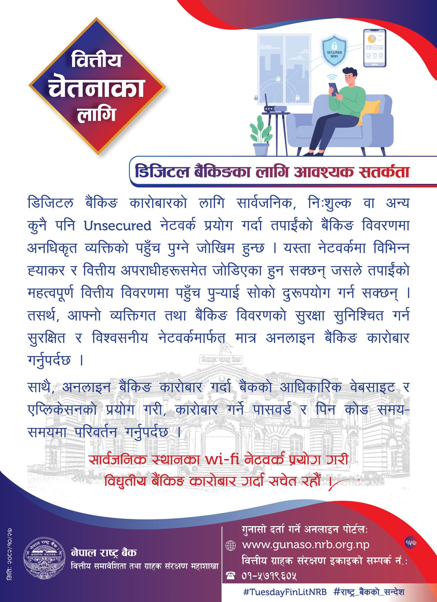 राष्ट्र बैंकले डिजिटल बैंकिङ कारोबारका लागि सार्वजनिक, नि:शुल्क वा अन्य कुनै पनि अनसेक्योर्ड नेटवर्क प्रयोग गर्दा व्यक्तिगत बैंकिङ विवरणमा अनधिकृत व्यक्तिको पहुँच पुग्ने जोखिम हुन सक्ने जनाएको छ।