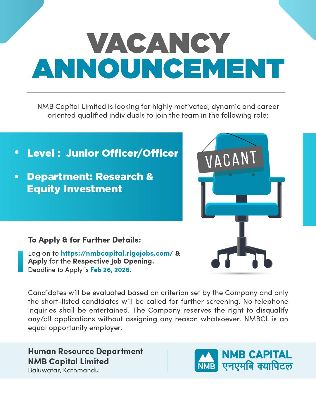 काठमाडौँ। एनएमबि क्यापिटलले कर्मचारी माग गरेको छ । कम्पनीले एक सूचना जारी गर्दै अफिसर र जुनियर अफिसर माग गरेको हो ।