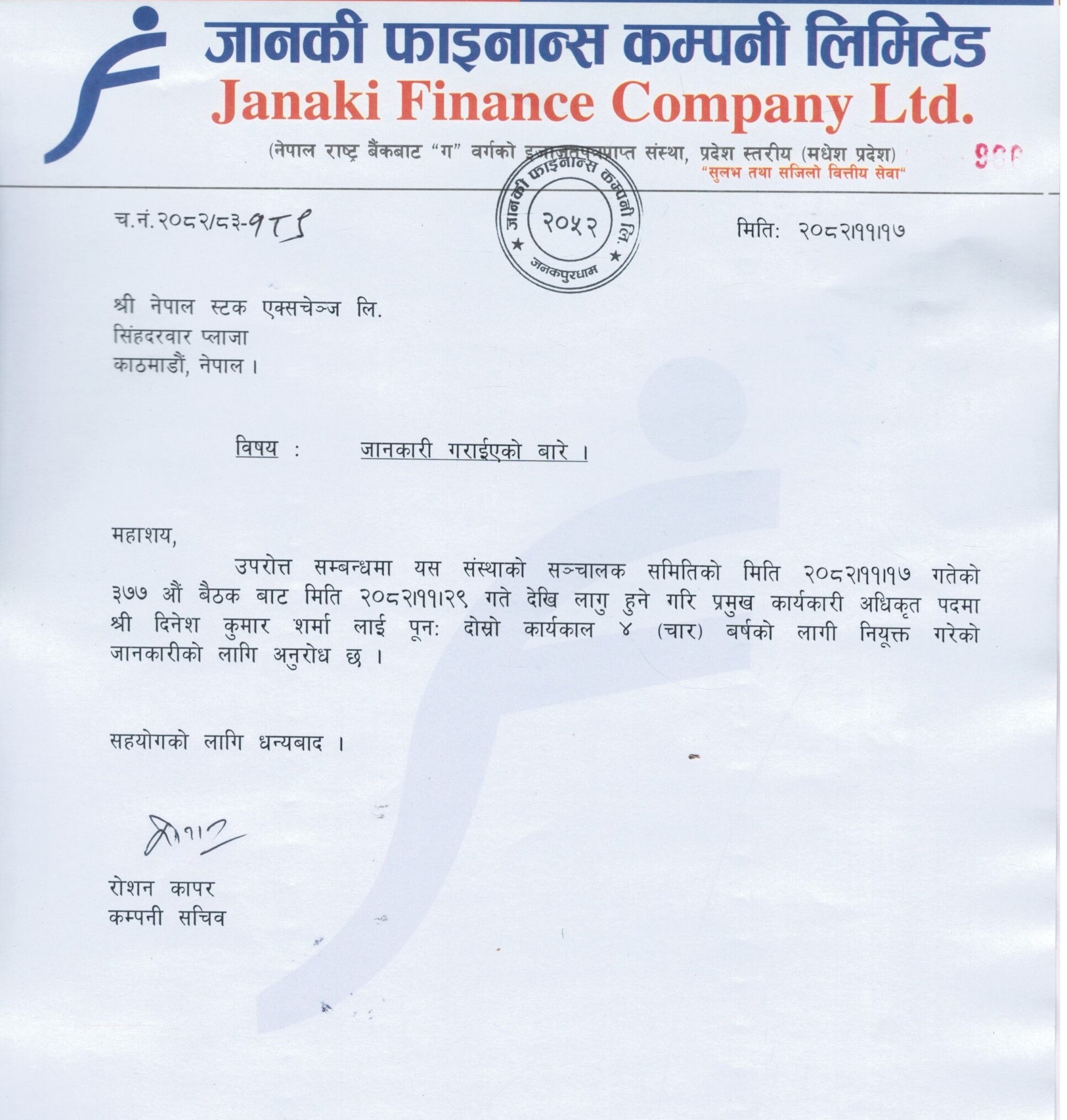 काठमाडौँ। जानकी फाइनान्सको प्रमुख कार्यकारी अधिकृत (सिइओ) मा दिनेश कुमार शर्मा पुन: नियुक्त भएका छन्। फाइनान्सको सिइओमा दिनेश कुमार शर्मा पुन: दोस्रो कार्यकालका लागि नियुक्त भएका हुन् ।
