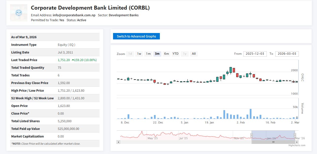 काठमाडौँ। कर्पोरेट डेभलपमेन्ट बैंकमा पोजेटिभ सर्किट लागेको छ। फागुन २५ गते अर्थात् सोमबार मार्केट खुल्ने बितिकै सेयर बजारमा हरियो घण्टी बजेको हो।