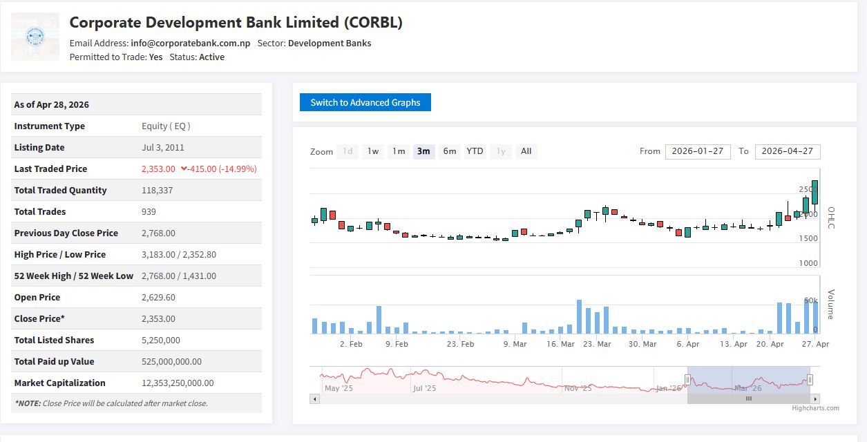 आज कर्पाेरेट डेभलपमेन्ट बैंकको सेयर मूल्यमा १४.९९ प्रतिशतको गिरावट आएको छ। सो बैंकको सेयर मूल्य प्रतिकित्ता २३ सय ५३ रुपैयाँमा झरेको छ।