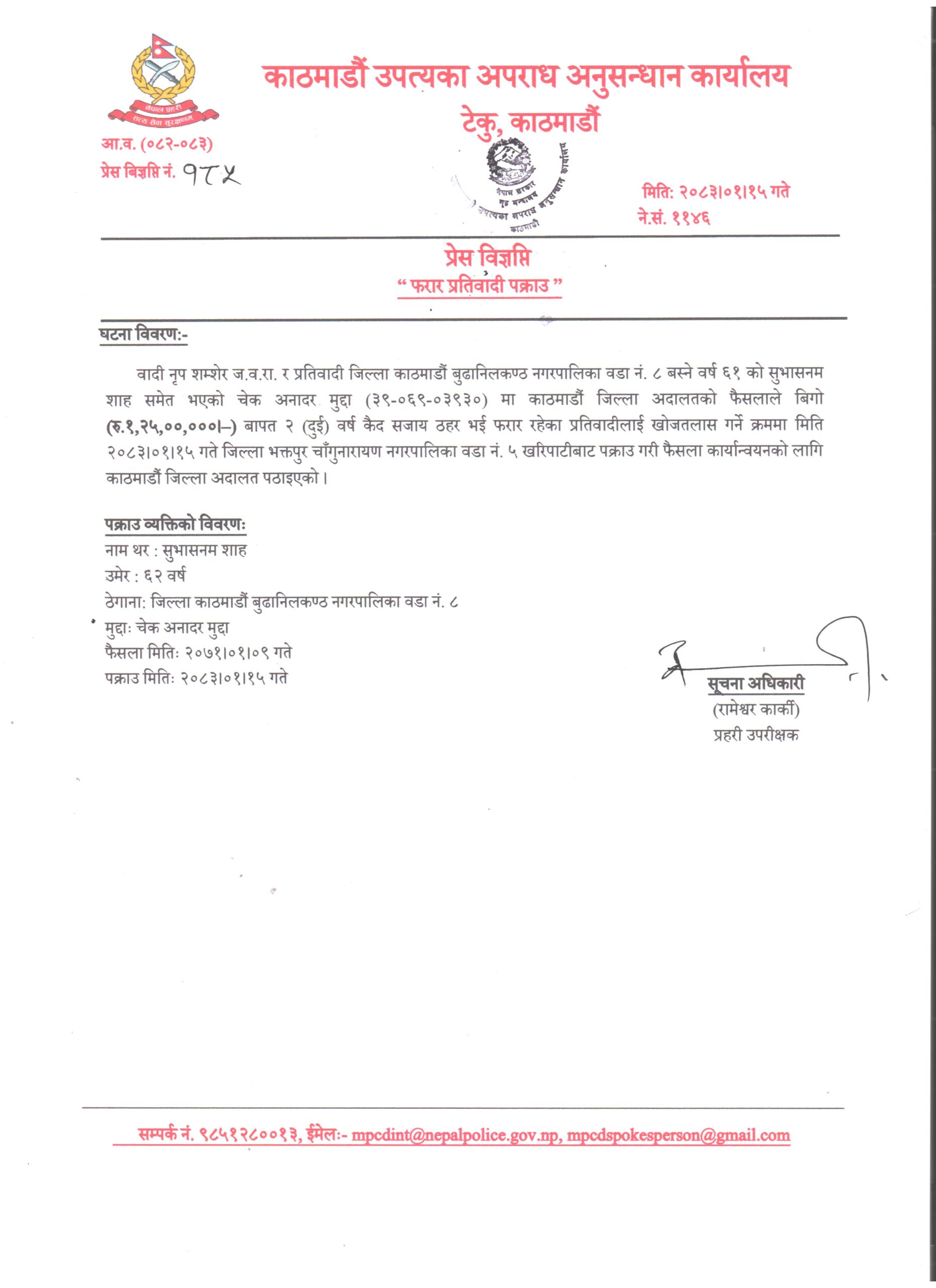 काठमाडौँ उपत्यका अपराध अनुसन्धान कार्यालयले एक सूचना जारी गर्दै यस्तो जनाएको हो।