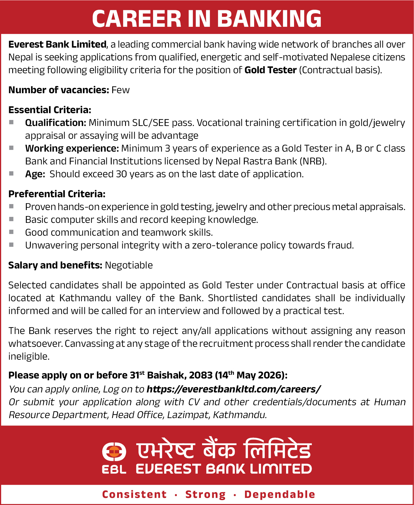 एभरेष्ट बैंकले गोल्ड टेस्टर पदमा काम गर्नका लागि १० पास भएकाहरूलाई अवसर खुलाएको हो। इच्छुक ३० वर्ष नकटेकाहरूले वैशाख ३१ गतेभित्र आवेदन दिन सक्नेछन्।